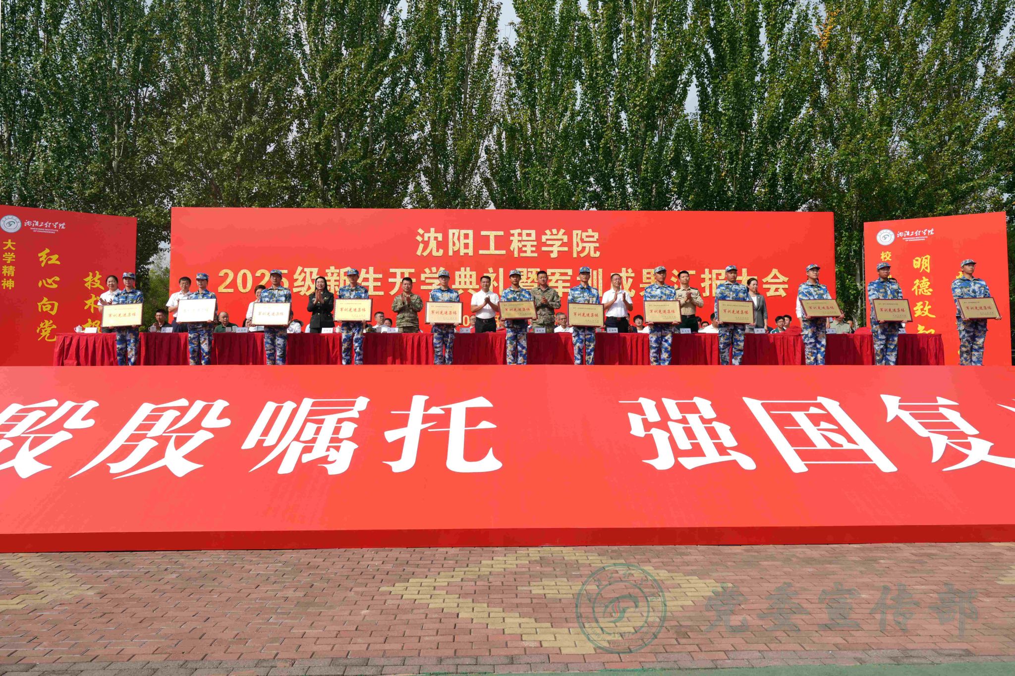 党委书记王强向承训部队赠送锦旗;纪委书记郝华宣读军训嘉奖令;副校长王启民宣读《beat365英国官方网站关于命名2024-2025学年“于川班”“于川团支部”“展志班”“展志团支部”的决定》;副校长赵琰为伏英娜颁发beat365英国官方网站思政育人校外专家导师聘书;嘉宾和校领导共同为先进集体、优秀助训教官、军训标兵代表颁奖,并为2025级新生代表佩戴校徽。