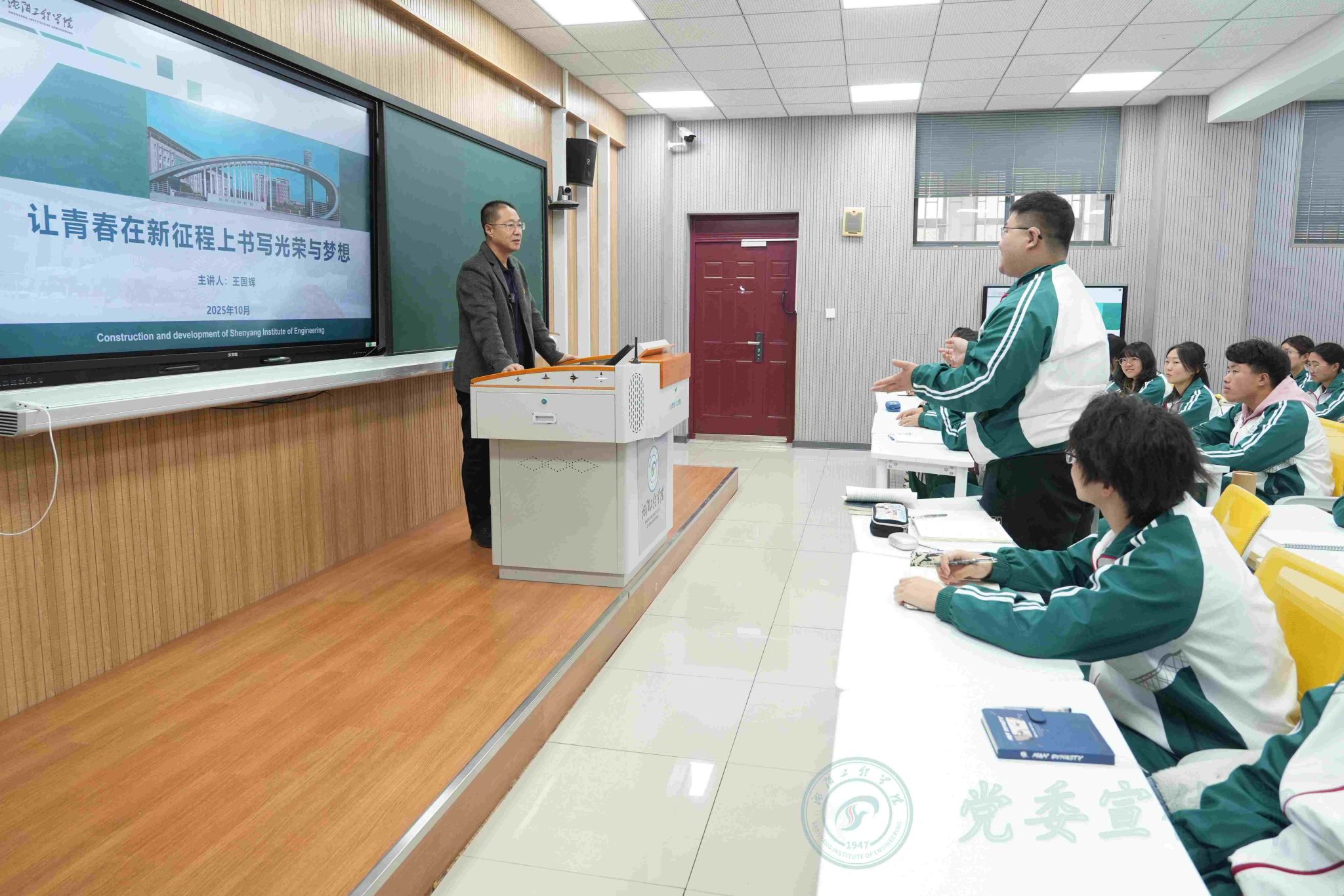 10月23日下午,校长王国辉在D218教室以“让青春在新征程上书写光荣与梦想”为题,为法学251、社工251两个班级的学生讲授了一堂生动的思政课。课程围绕争做沈工程精神的赓续者、又红又专又实的新传人、伟大复兴的追梦人三个方面,勉励青年学生在强国建设、民族复兴伟业中绽放青春光彩。