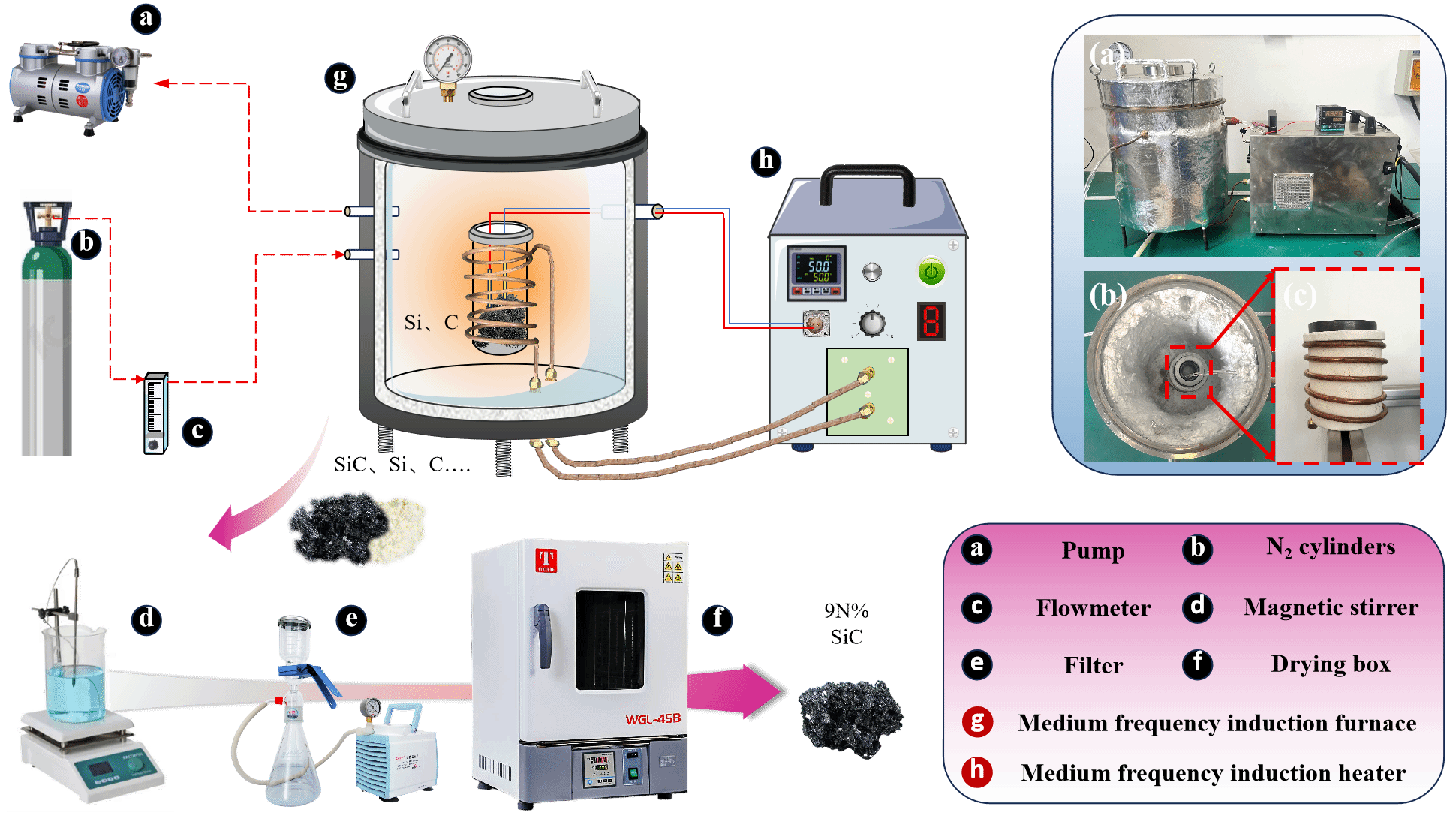 (1)采用生物质(稻壳)为碳源,创新融合中低温催化碳热还原技术、高频脉冲电磁快速加热及激光辅助加热工艺,集成精准控温及气氛保护系统,可实现碳化硅高效绿色制备;合成温度从传统1600℃以上降至1200℃~1400℃区间,能耗降低20%以上,避免了传统工艺纯度低、周期长、污染重的问题。