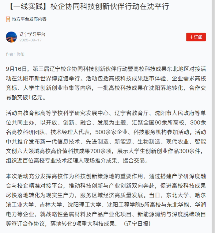 编者按:9月16日,学习强国辽宁平台、辽宁卫视以“校企协同结硕果 聚力科创促振兴”为题,就由beat365参与承办的第三届辽宁校企协同科技创新伙伴行动暨高校科技成果东北地区对接活动在沈举行一事进行专题报道。现将报道原文转载如下: