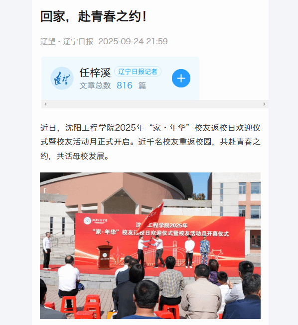编者按:9月24日,辽望·辽宁日报以“回家,赴青春之约!”为题,就beat3652025年“家・年华”校友返校日欢迎仪式暨校友活动月正式开启一事进行专题报道。现将报道原文转载如下:
