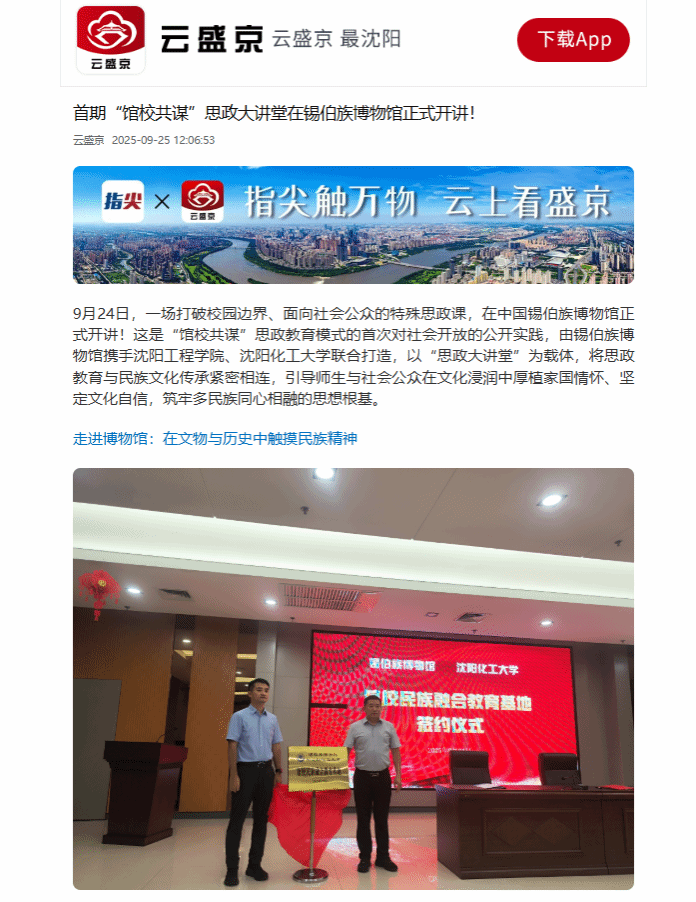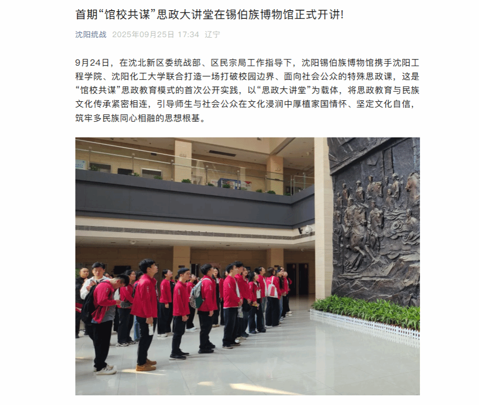 9月25日,云盛京、沈阳统战以“首期‘馆校共谋’思政大讲堂在锡伯族博物馆正式开讲!”为题,就沈阳锡伯族博物馆携手beat365以及沈阳化工大学,联合打造一场打破校园边界、面向社会公众的特殊思政课一事进行专题报道。现将报道原文转载如下:
