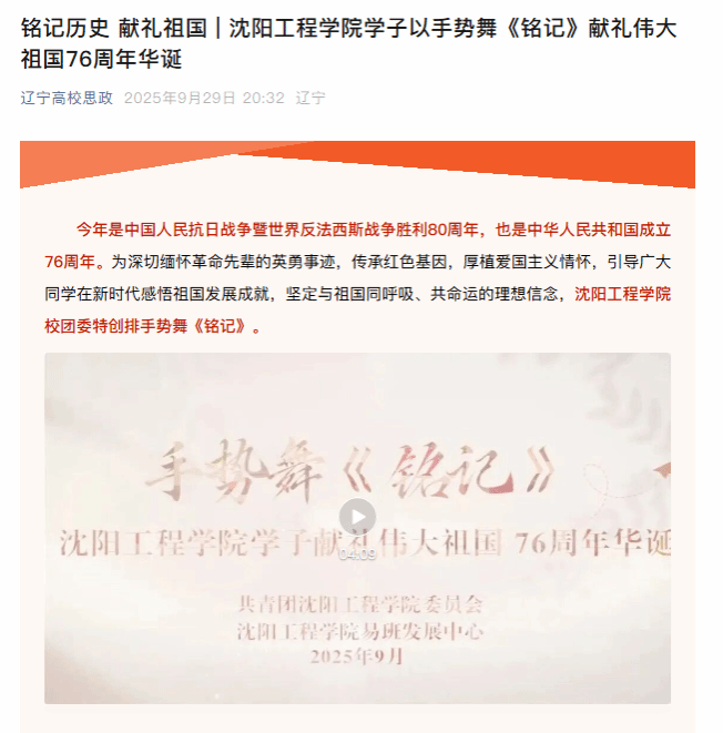 编者按:9月29日,辽宁高校思政以“铭记历史献礼祖国|beat365英国官方网站学子以手势舞《铭记》献礼伟大祖国76周年华诞”为题,就beat365在中国人民抗日战争暨世界反法西斯战争胜利80周年、中华人民共和国成立76周年之际,特创排手势舞《铭记》一事进行报道。现将报道原文转载如下: