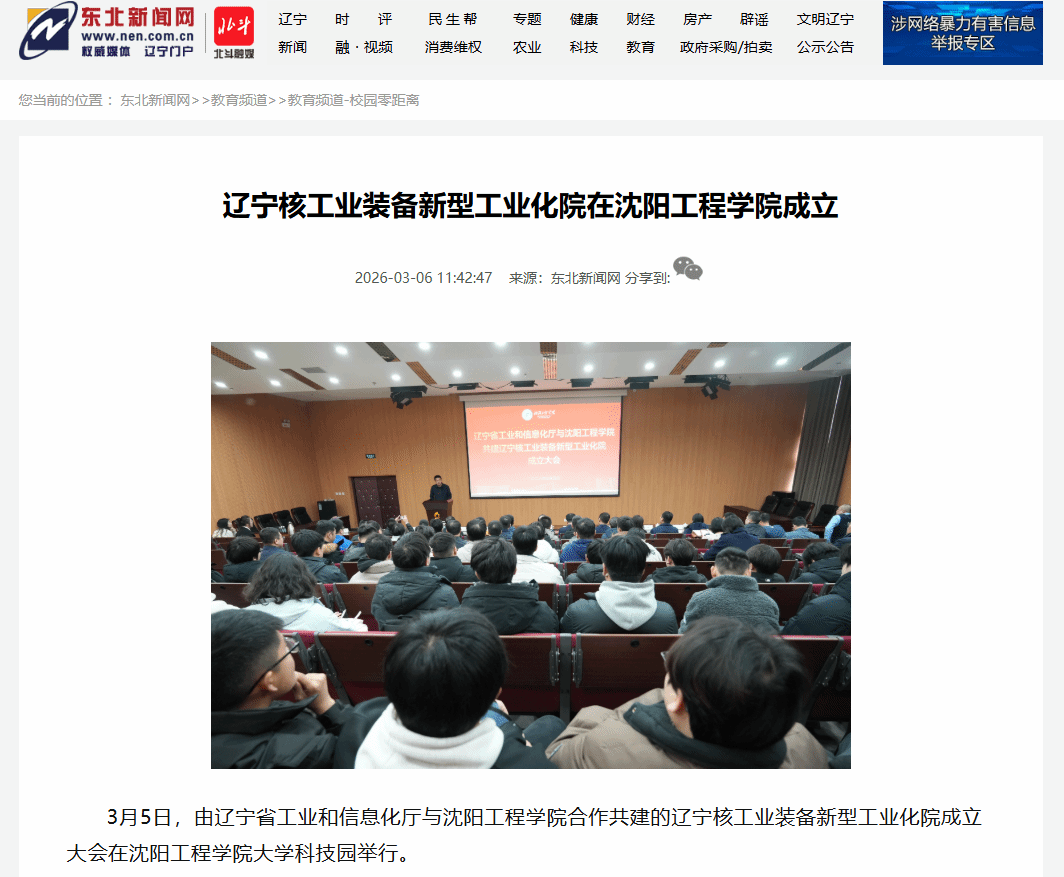 编者按:3月10日,东北新闻网以“辽宁核工业装备新型工业化院在beat365英国官方网站成立”为题,就辽宁核工业装备新型工业化院成立大会在beat365举行一事进行报道。该院由省工业和信息化厅与beat365合作共建,旨在全面落实国家新型工业化战略,破解产业转型瓶颈,该院成立标志辽宁核工业在创新链、产业链、人才链、资金链协同发展中迈出关键一步。现将报道原文转载如下: