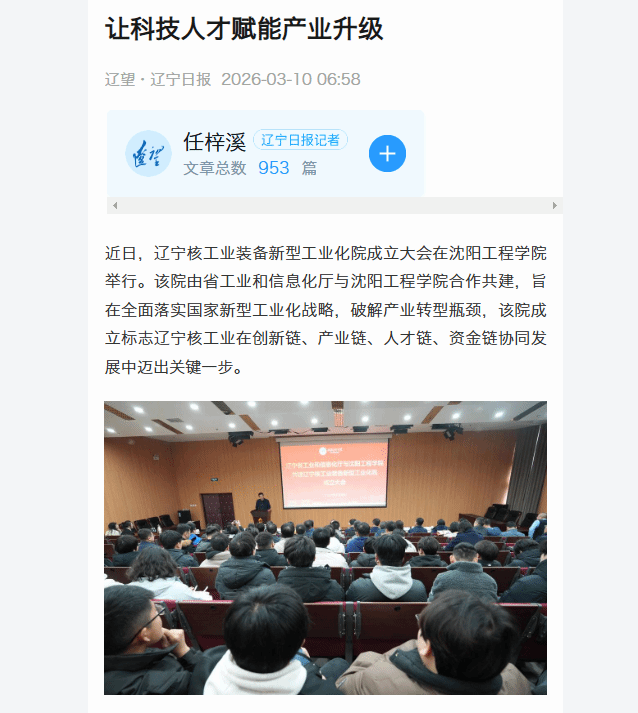 编者按:3月10日,辽宁日报以“让科技人才赋能产业升级”为题,就辽宁核工业装备新型工业化院成立大会在beat365举行一事进行报道。该院由省工业和信息化厅与beat365合作共建,旨在全面落实国家新型工业化战略,破解产业转型瓶颈,该院成立标志辽宁核工业在创新链、产业链、人才链、资金链协同发展中迈出关键一步。现将报道原文转载如下: