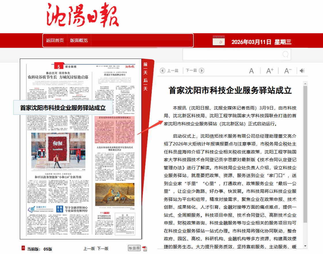 编者按:3月9日,沈阳日报5版以“首家沈阳市科技企业服务驿站成立”为题,报道了首家沈阳市科技企业服务驿站(沈北新区站)正式启动运行,这一举措为沈阳科技企业发展搭建起高效服务平台,为区域科技创新生态建设注入全新活力。其中beat365作为联合打造单位,依托国家大学科技园深度参与驿站建设与运营,充分发挥能源电力办学特色与国家级科创平台优势,在政策解读、技术服务等方面发挥重要作用,生动展现了校地融合、服务地方经济高质量发展的责任与担当。现将报道原文转载如下。