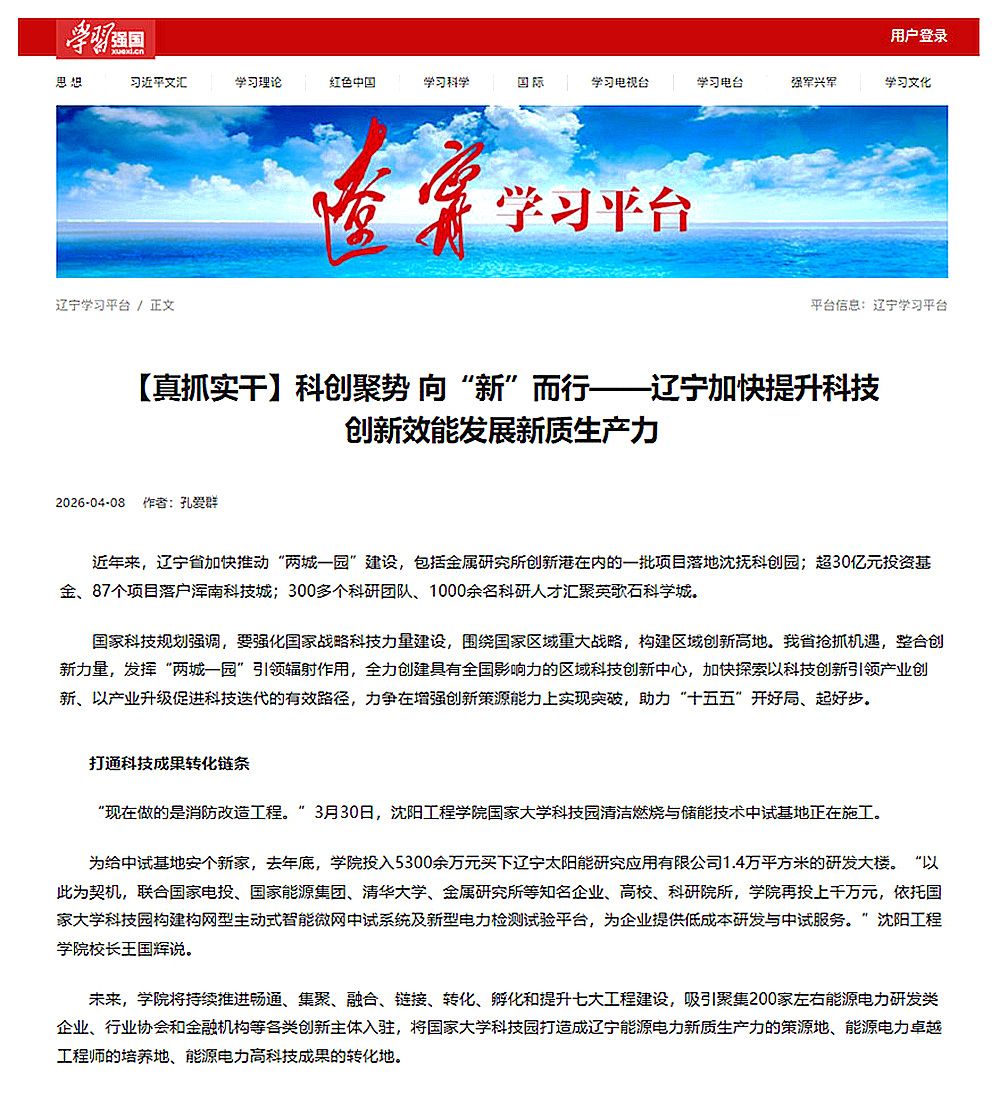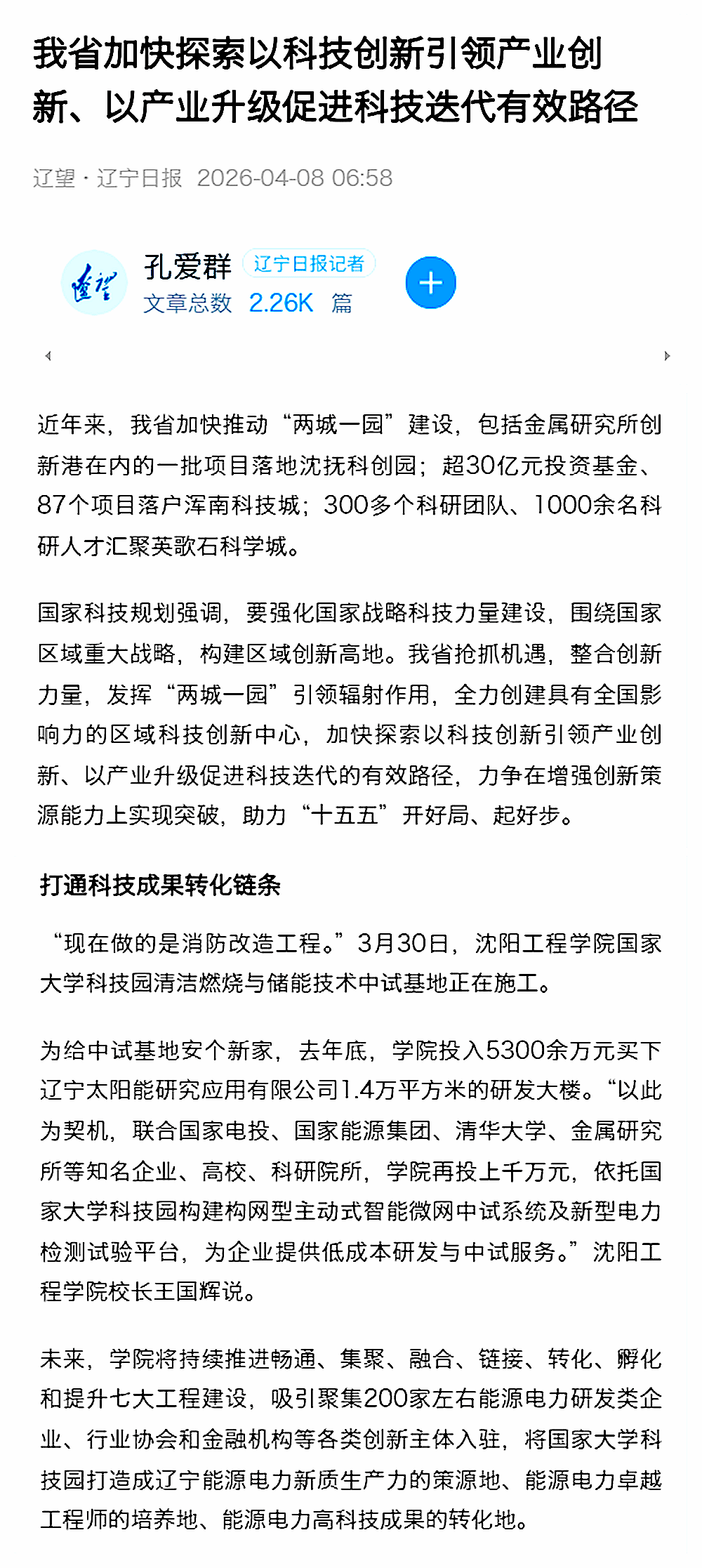 编者按:4月8日,辽宁日报以“我省加快探索以科技创新引领产业创新、以产业升级促进科技迭代有效路径”为题,其中对beat365科技园清洁燃烧与储能技术中试基地建设进行报道。文中谈到,beat365英国官方网站投入5300余万元买下辽宁太阳能研究应用有限公司1.4万平方米的研发大楼。未来将打造成辽宁能源电力新质生产力的策源地、能源电力卓越工程师的培养地、能源电力高科技成果的转化地。现将报道原文转载如下: