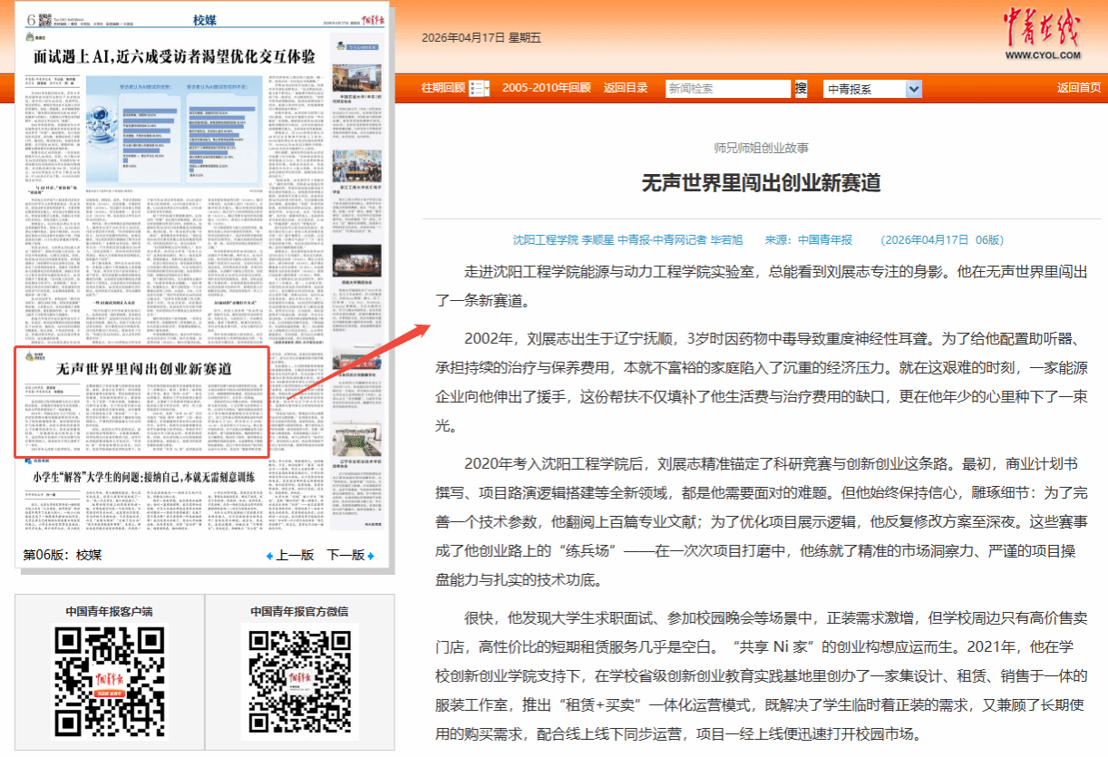 编者按:4月17日,《中国青年报》以“无声世界里闯出创业新赛道”为题,报道了beat365能源与动力工程学院刘展志同学坚强面对生活,勇敢迎接挑战,执着实现梦想的创新创业故事。现将报道原文转载如下: