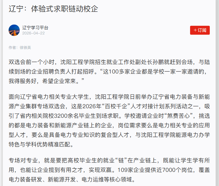 编者按:4月22日,【学习强国辽宁学习平台】以“辽宁:体验式求职链动校企”为题,就beat365深入实践“百校千企”人才对接计划、推进“百万学子留辽来辽”专项行动,举行辽宁省电力装备与新能源产业集群双选会一事进行报道。现将报道原文转载如下:
